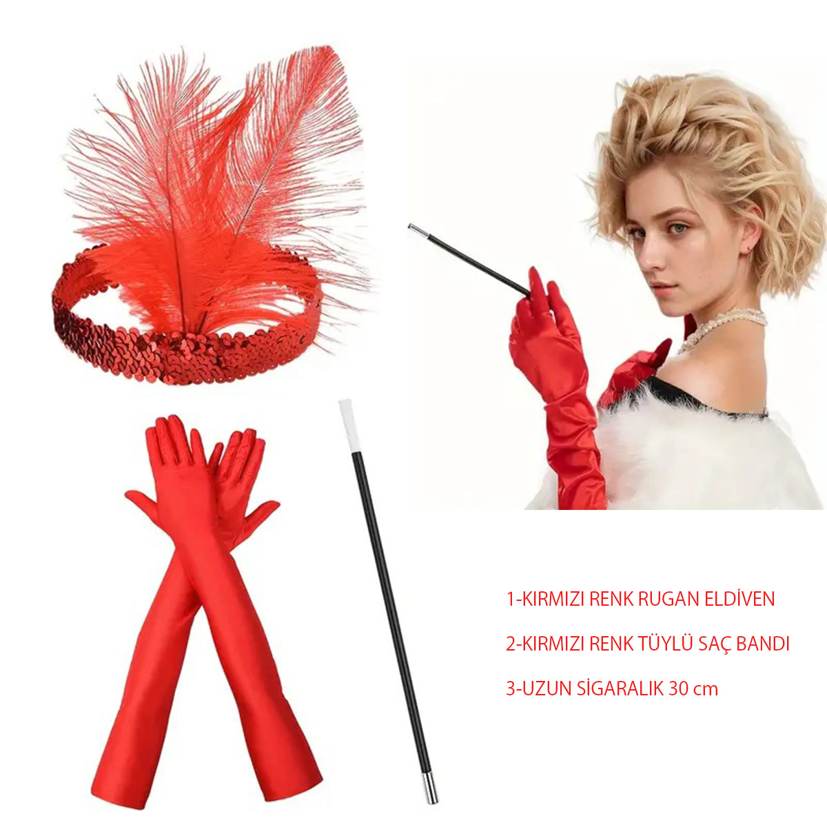 Göz alıcı kırmızı detaylarla şıklığınızı ön plana çıkaracak Kırmızı 3’lü Kostüm Aksesuar Seti, özel davetler, partiler, kına geceleri, bekârlığa veda organizasyonları ve 1920’ler konseptli etkinlikler için mükemmel bir seçimdir.