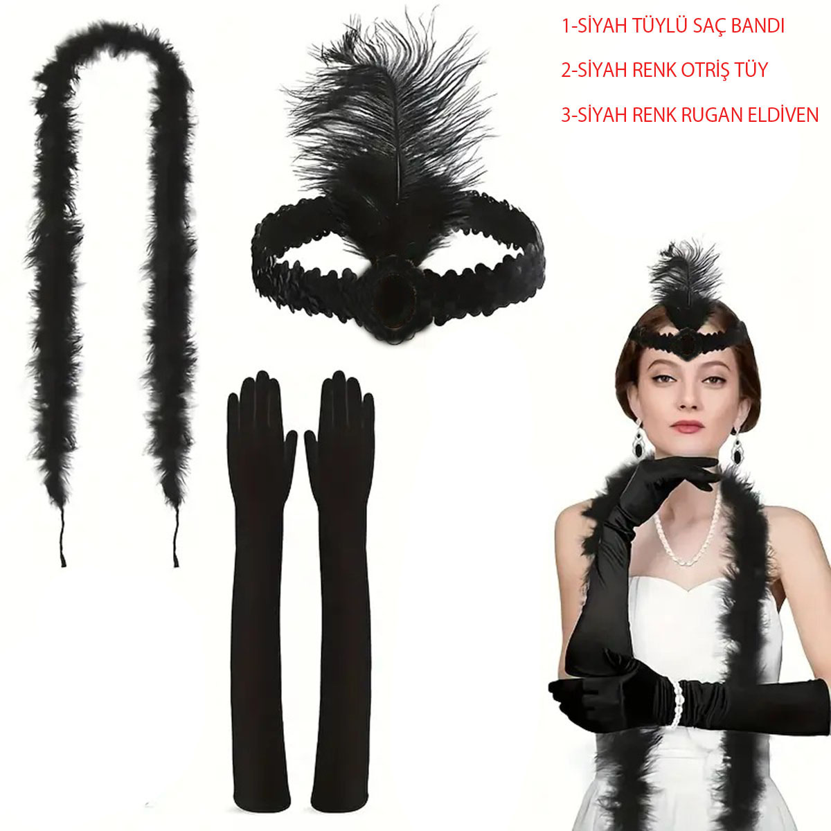 Şıklığı ve asaleti bir arada sunan Siyah 3’lü Kostüm Aksesuar Seti, özel davetler, partiler, kına geceleri, bekârlığa veda organizasyonları ve 1920’ler temalı konseptlerde tarzınızı tamamlamak için ideal bir seçimdir.