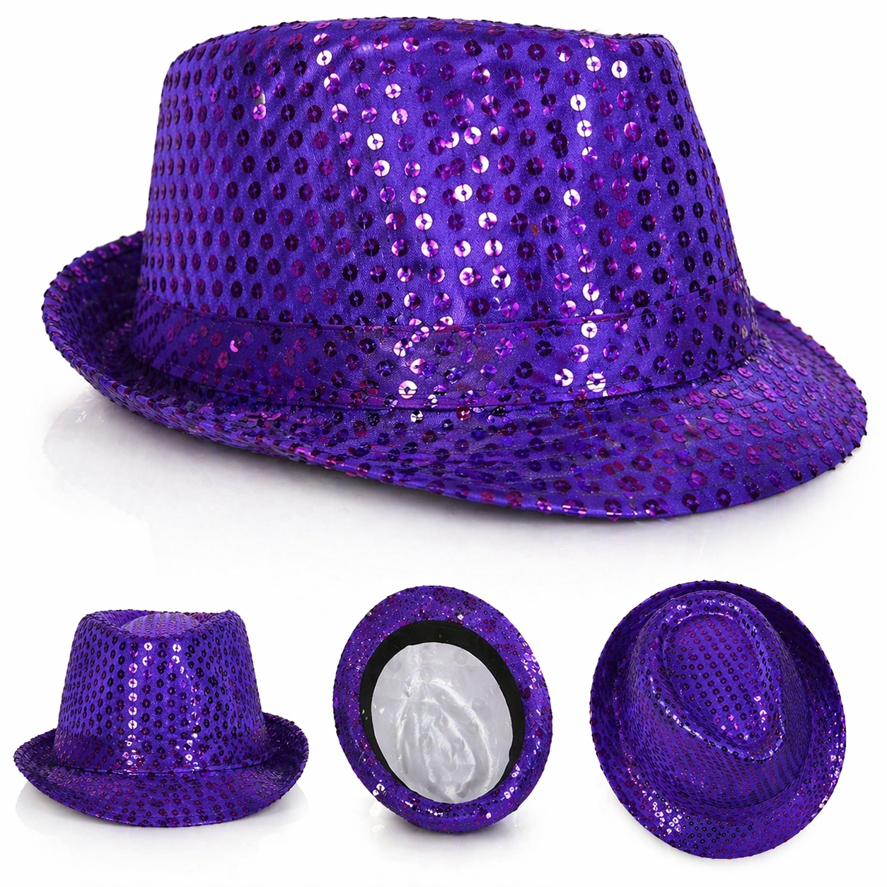 Mor payet kaplama tasarımıyla dikkat çeken bu şapka, ışık altında parlayarak ortamın enerjisini yükseltir. Yetişkin kullanımına uygun standart ölçüsü sayesinde rahat bir kullanım sunar.