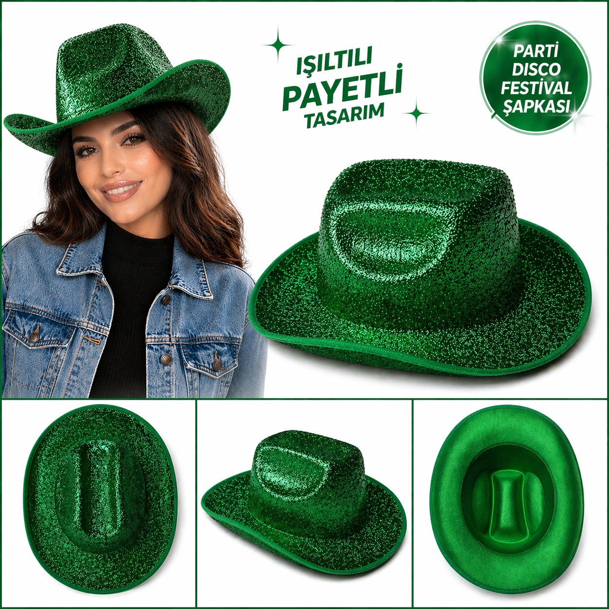 Parlak ve dikkat çekici tasarımıyla öne çıkan yeşil payetli kovboy şapka, parti ve eğlence konseptlerinin vazgeçilmez aksesuarıdır. Işıltılı yüzeyi sayesinde bulunduğunuz ortamda tüm dikkatleri üzerinize çeker.